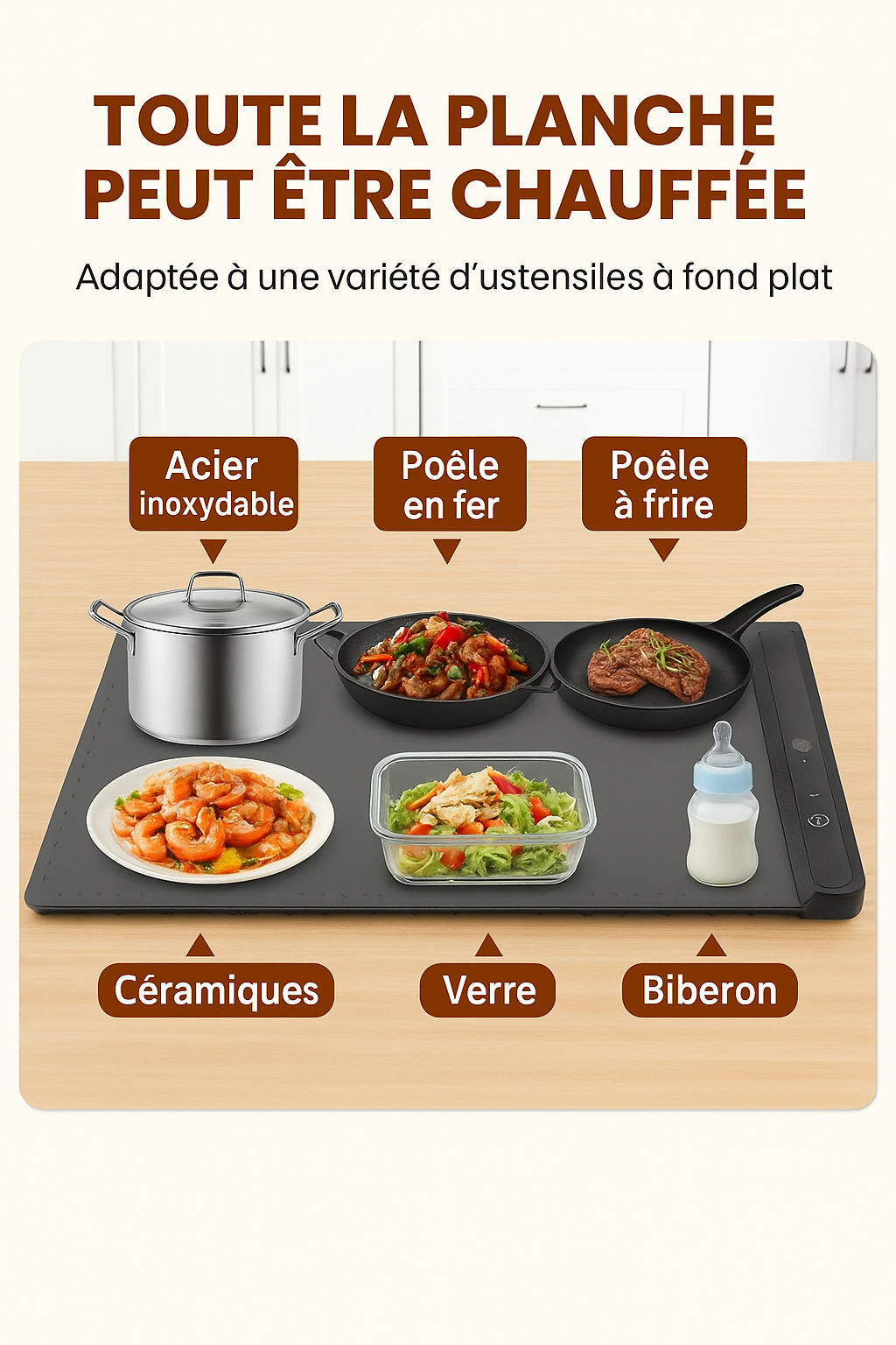 une plaque innovante qui permet de garder une grande variété de plats et contenants à la bonne température, qu’ils soient en acier inoxydable, fer, céramique, verre ou même biberon. Chaque membre de la famille ou invité peut profiter de plats chauds et délicieux, quelle que soit la vaisselle utilisée.