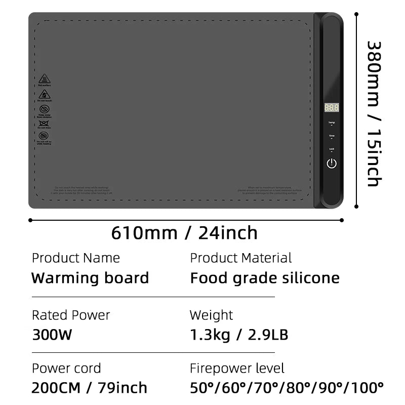 Le tapis devient visiblement chaud après seulement 5 secondes et atteint la température désirée en quelques minutes. Avec 8 niveaux de chaleur ajustables , vous aurez rapidement de la nourriture parfaitement chaude prête à servir.