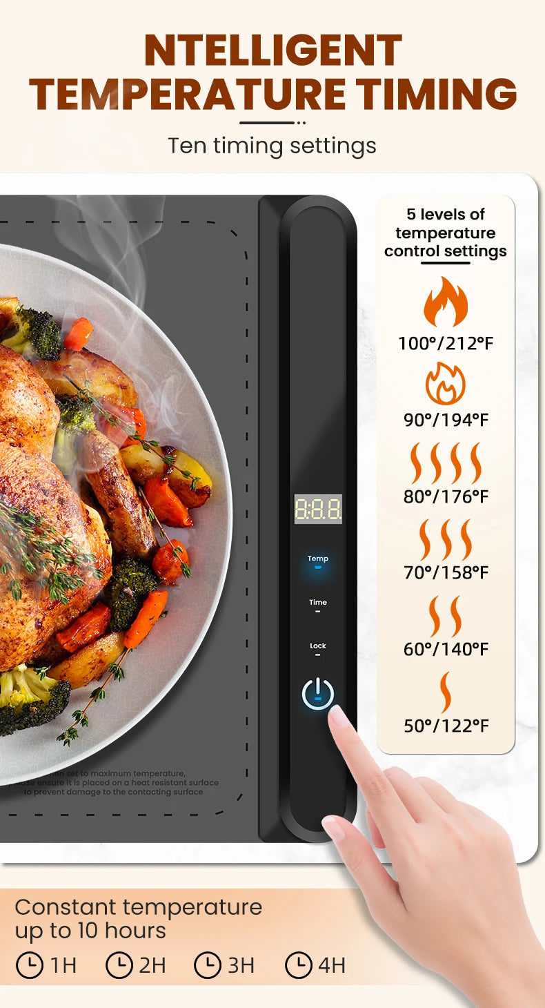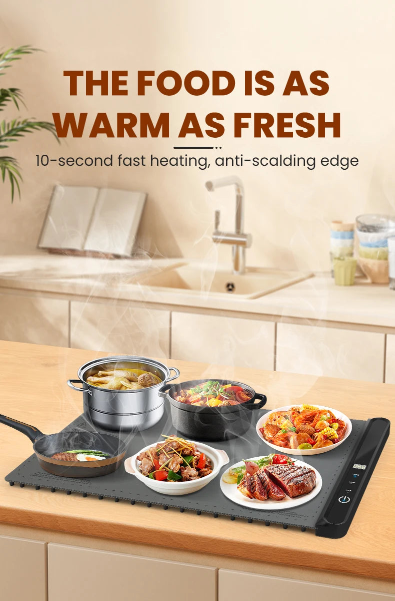 Le tapis réchauffe doucement les aliments froids à la température parfaite de service et garde les plats chauds pendant des heures.